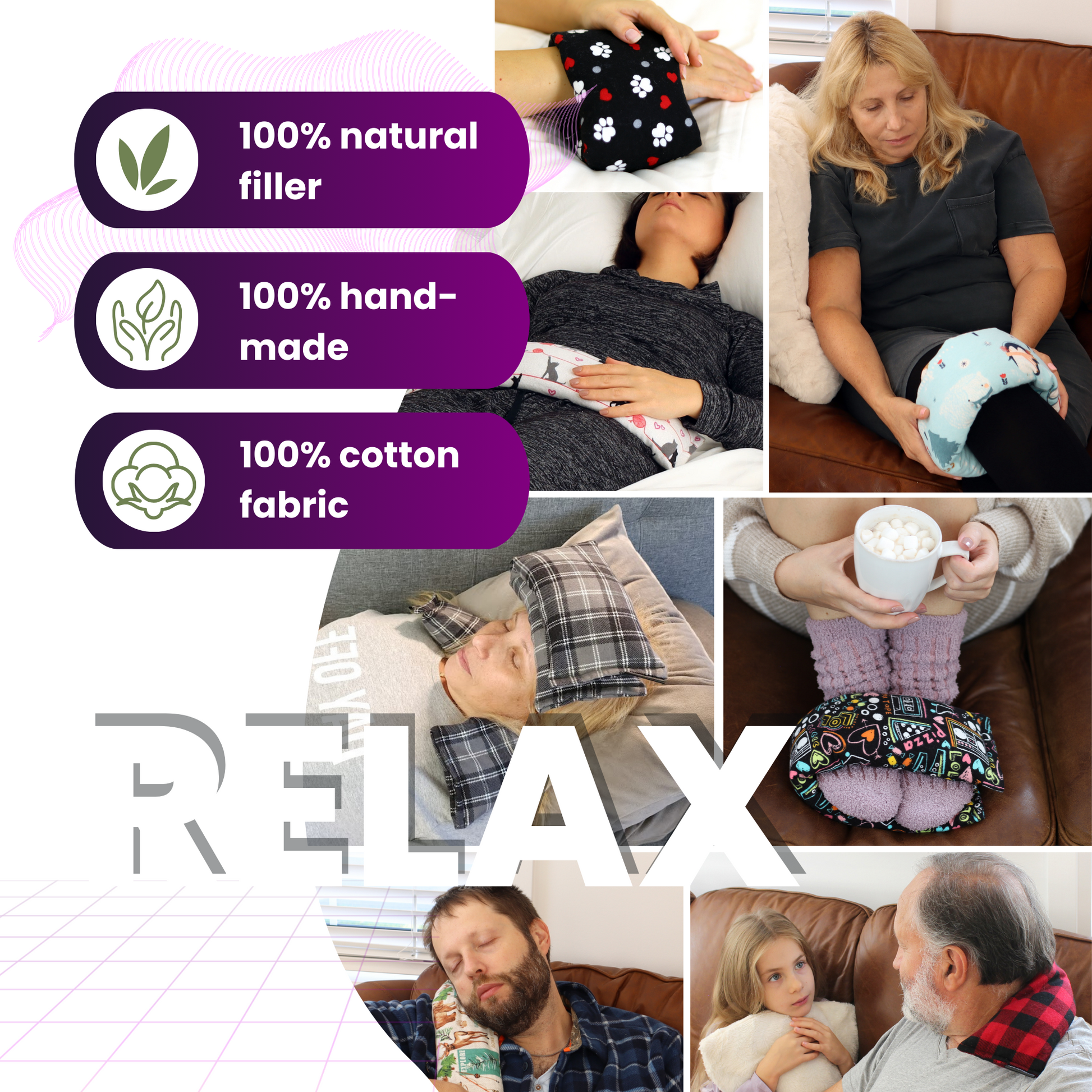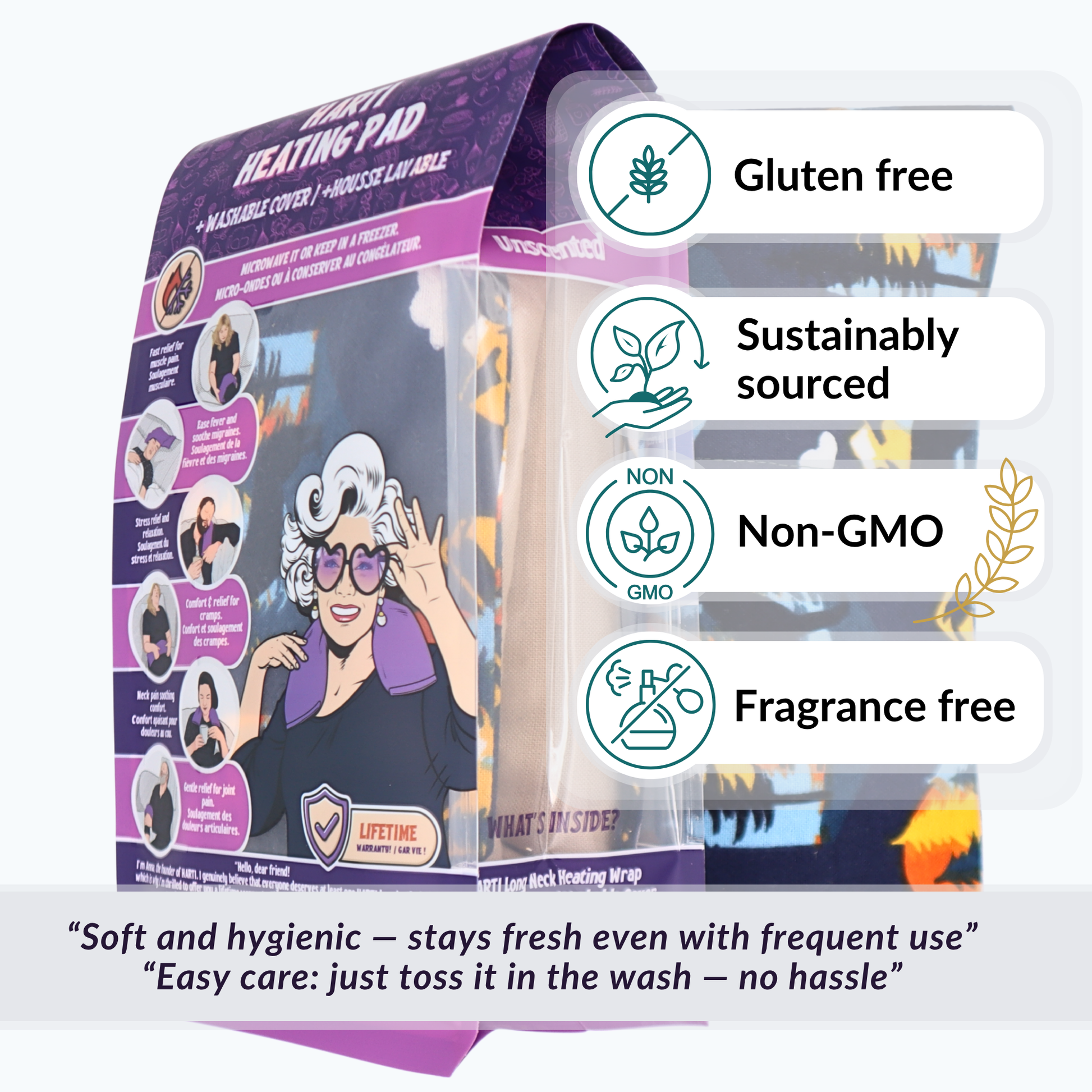 We use only whole Canadian-grown oats (non-GMO, gluten-free) that naturally retain heat and release a soothing, moist warmth. No chemicals, no gels, just pure nature in every pad.