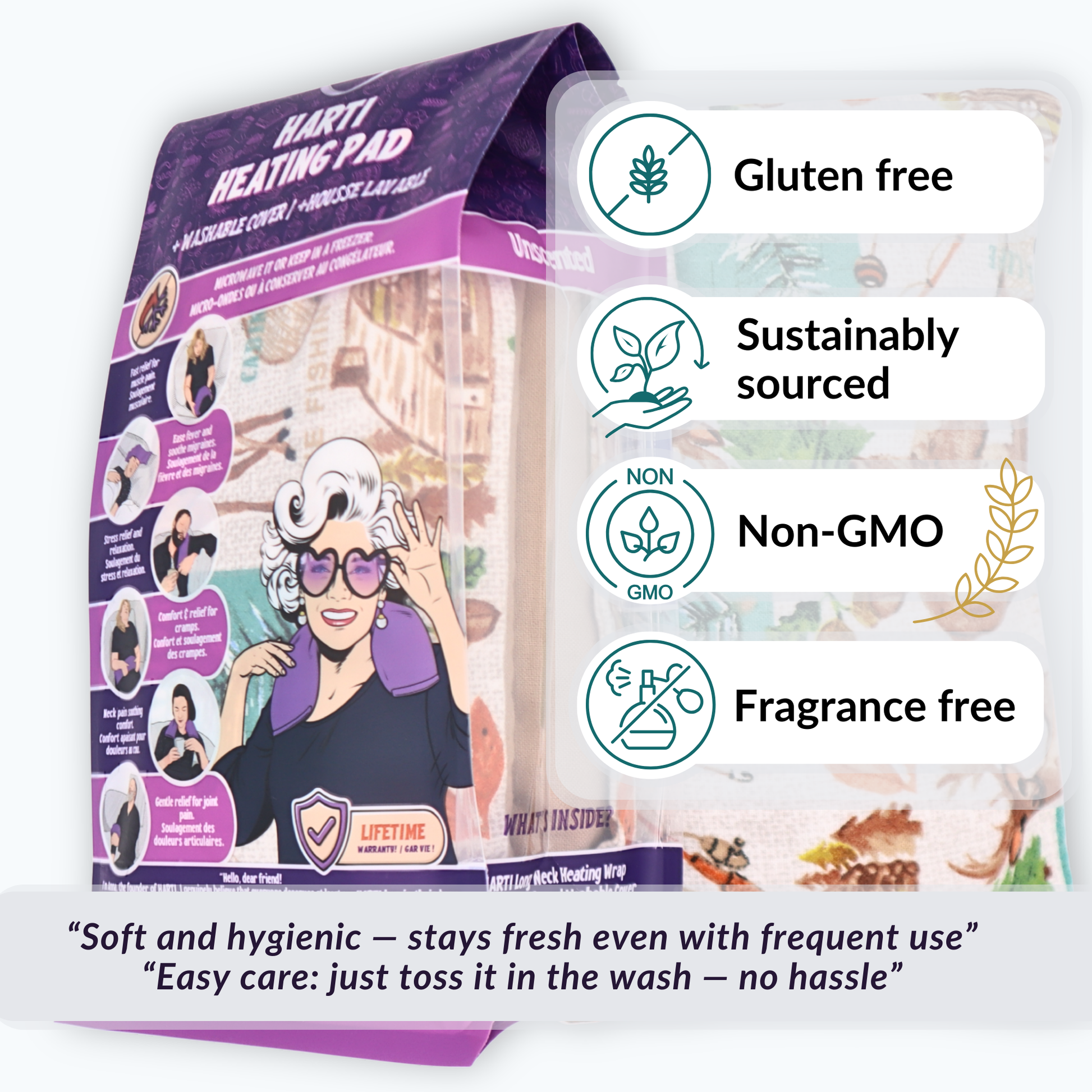 We use only whole Canadian-grown oats (non-GMO, gluten-free) that naturally retain heat and release a soothing, moist warmth. No chemicals, no gels, just pure nature in every pad.