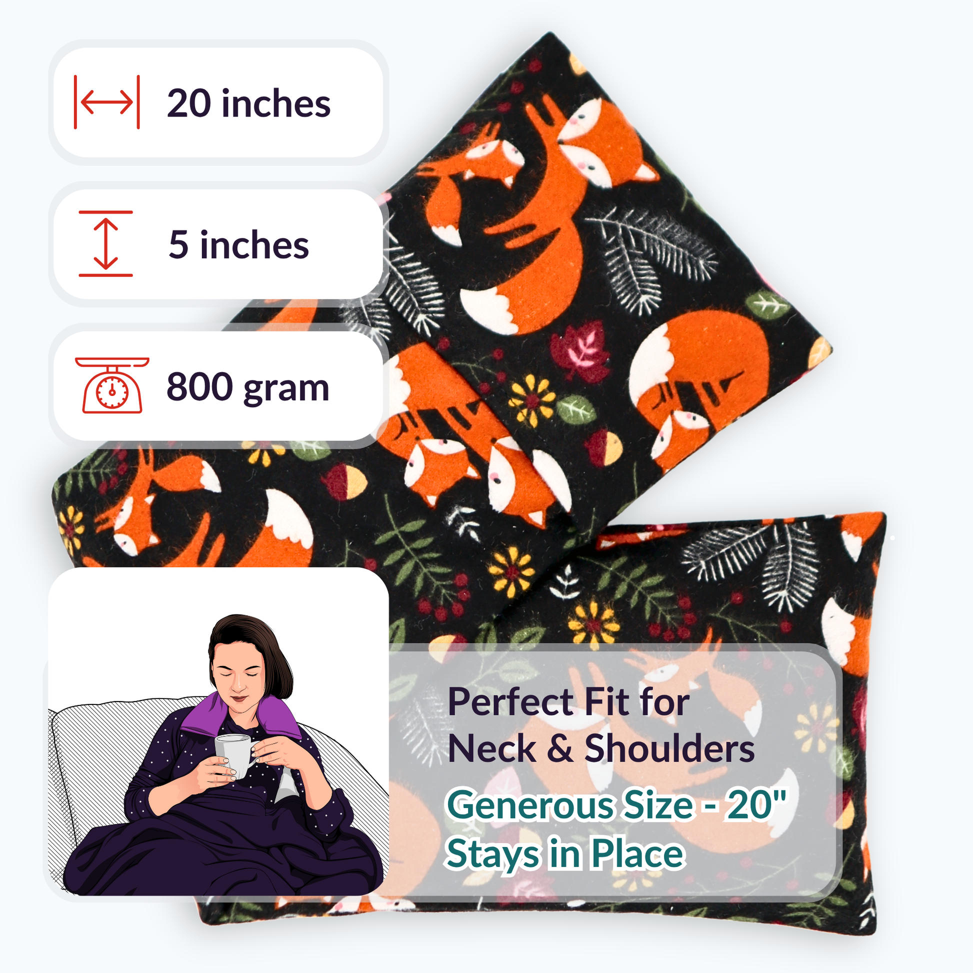 Sized at 20” x 5”, this heating pad molds comfortably to your neck, shoulders, back, stomach, or knees—delivering warmth exactly where you need it most.