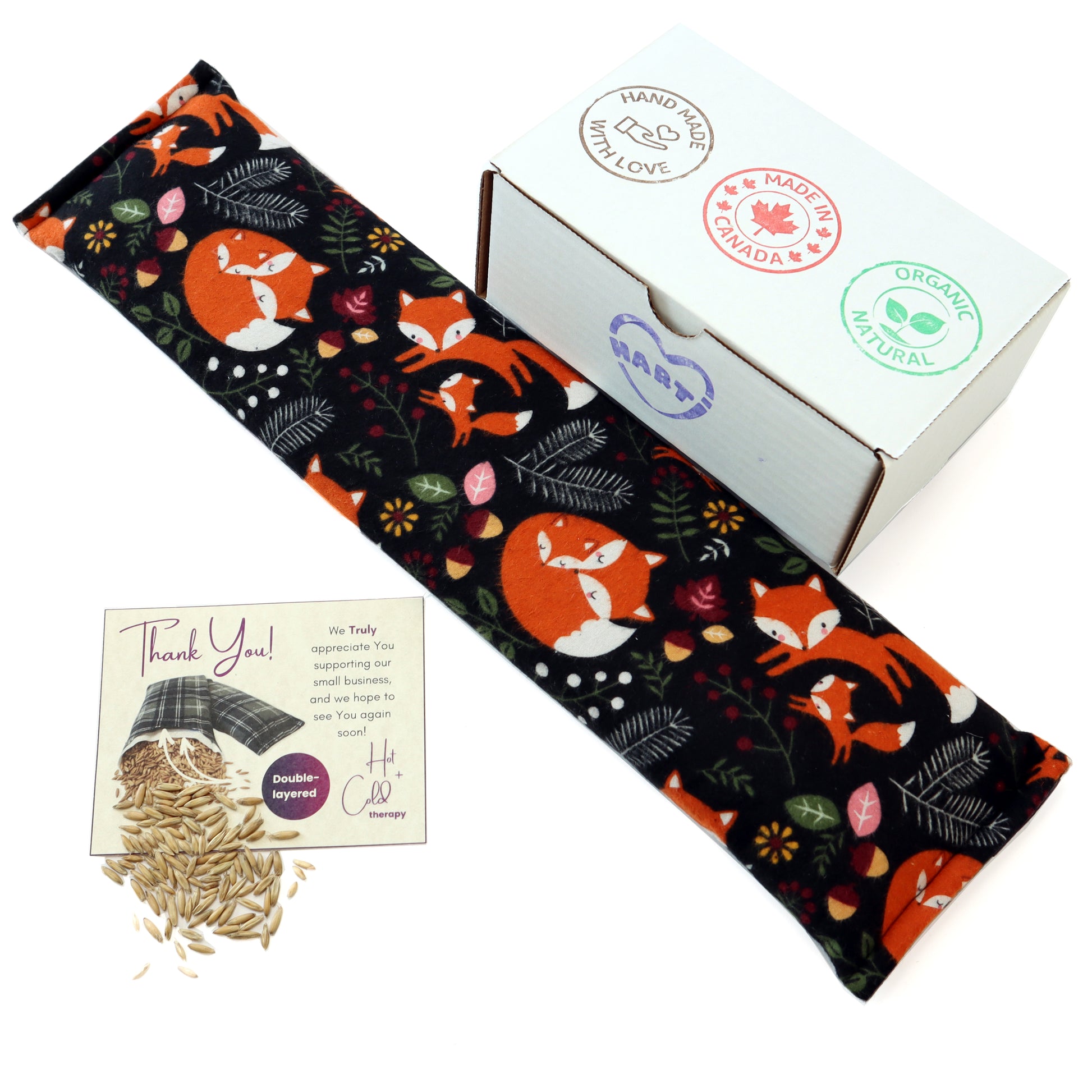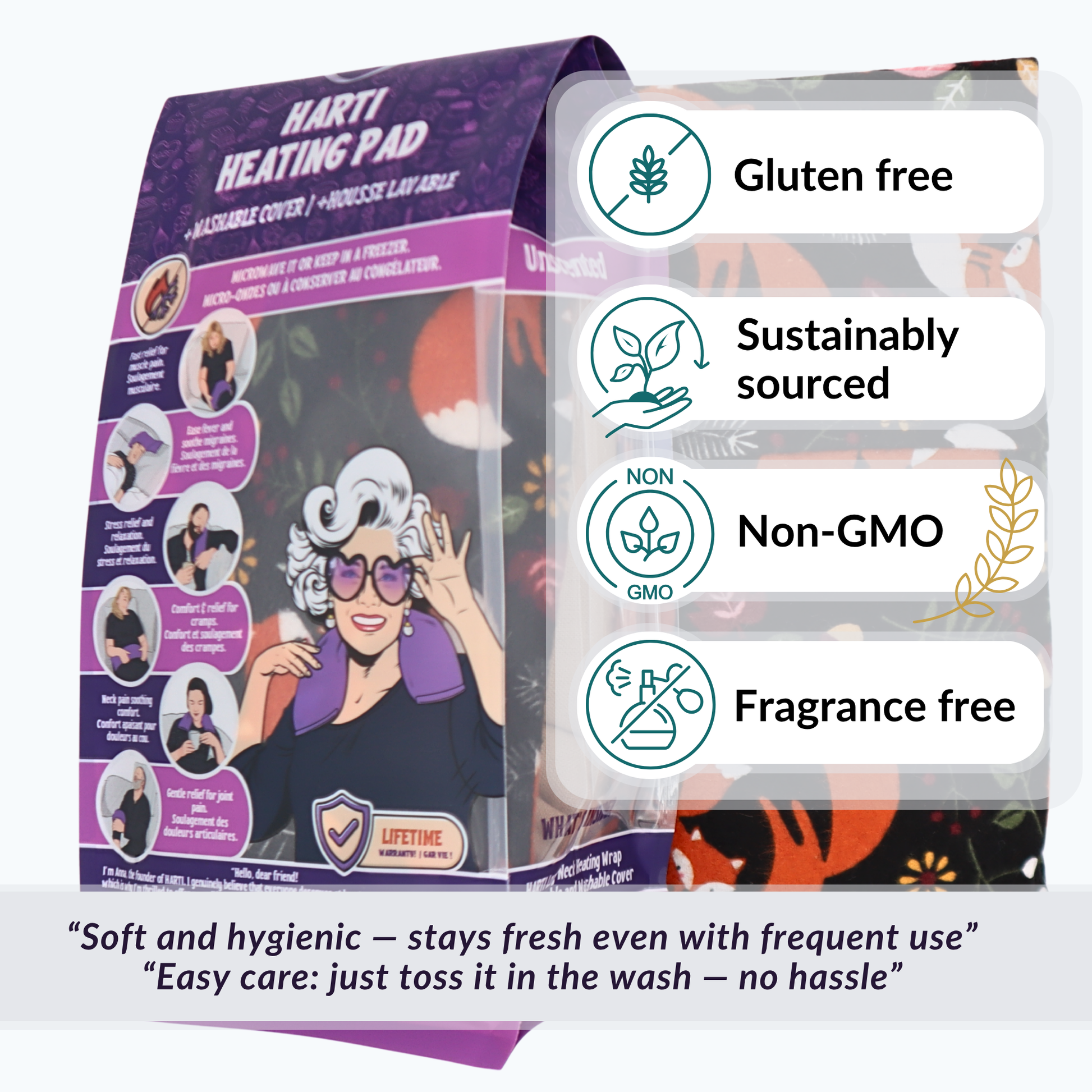 We use only whole Canadian-grown oats (non-GMO, gluten-free) that naturally retain heat and release a soothing, moist warmth. No chemicals, no gels, just pure nature in every pad.