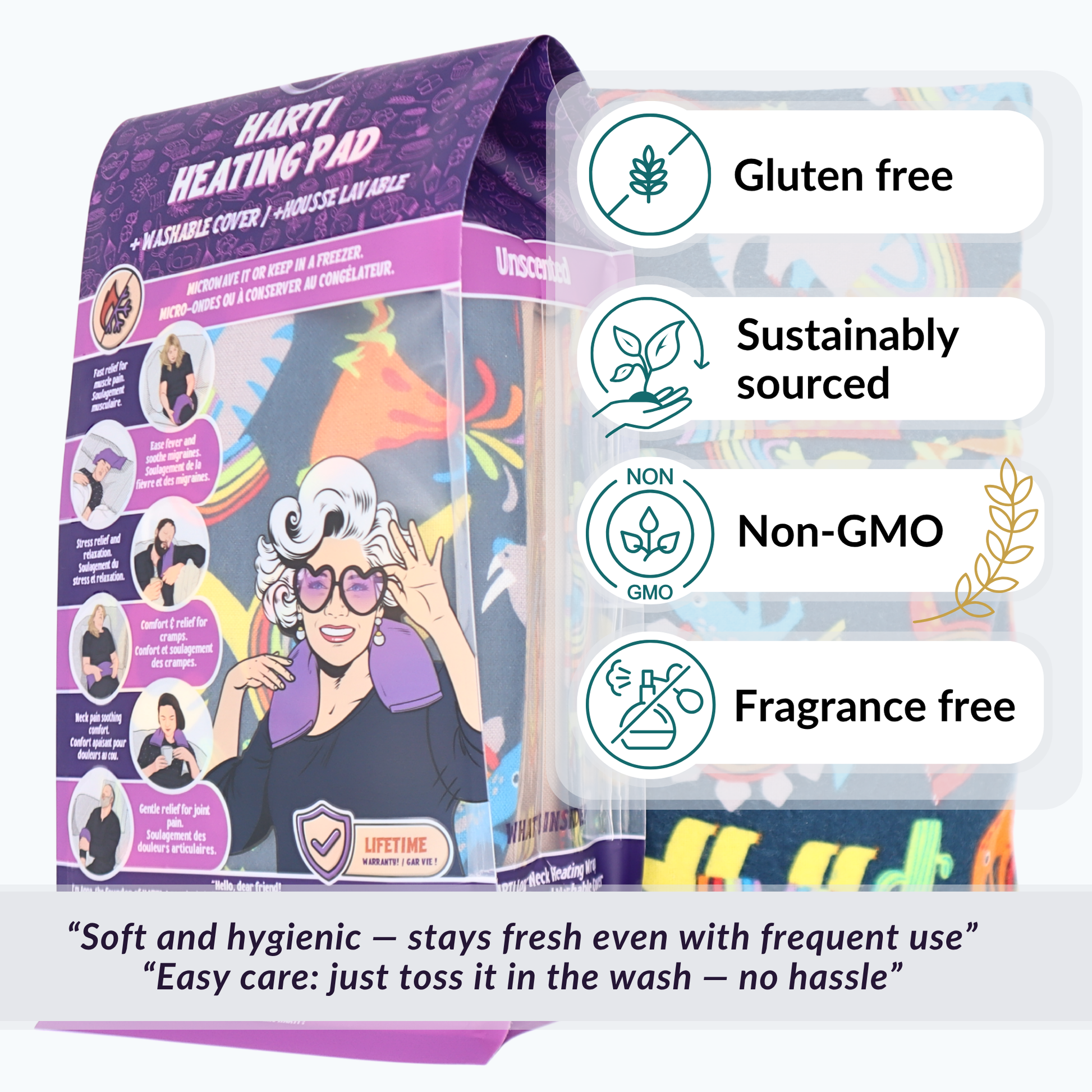 We use only whole Canadian-grown oats (non-GMO, gluten-free) that naturally retain heat and release a soothing, moist warmth. No chemicals, no gels, just pure nature in every pad.