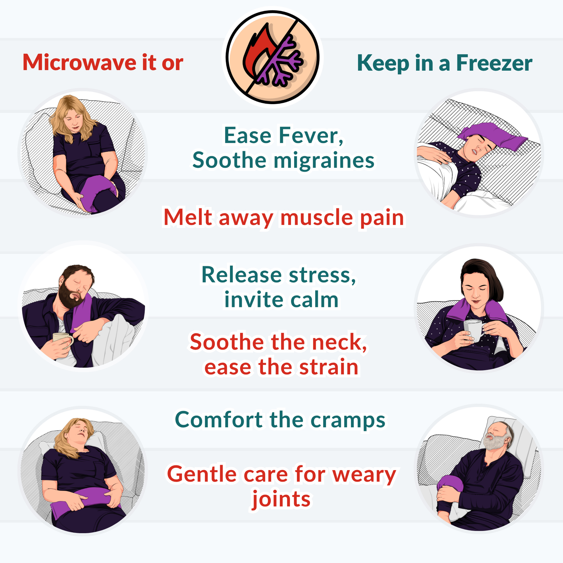 Warm it in the microwave for about 2 minutes for deep, lasting heat—or store it in the freezer for a refreshing cool compress. One pad, endless uses: muscle aches, cramps, headaches, swelling, or simple relaxation.