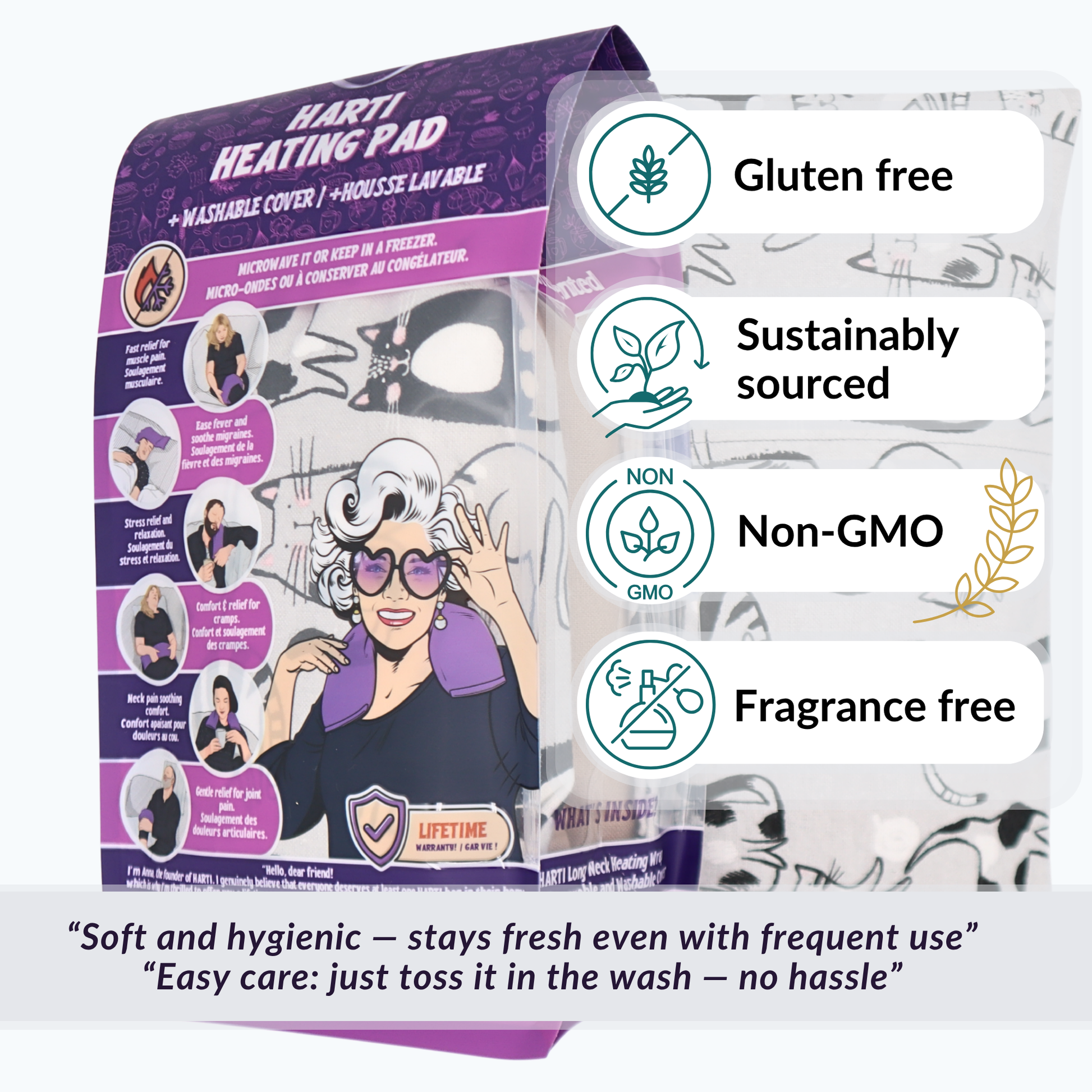 We use only whole Canadian-grown oats (non-GMO, gluten-free) that naturally retain heat and release a soothing, moist warmth. No chemicals, no gels, just pure nature in every pad.