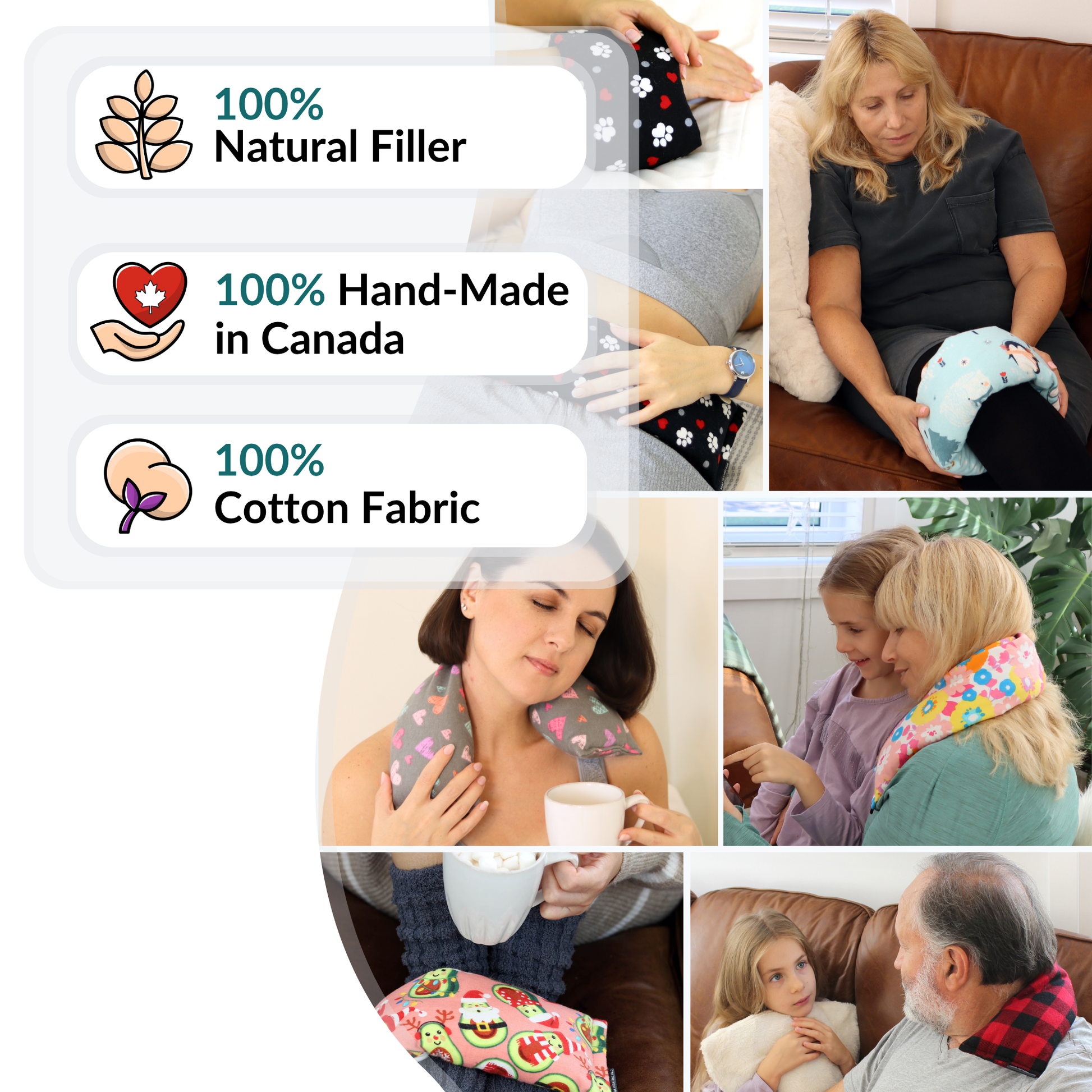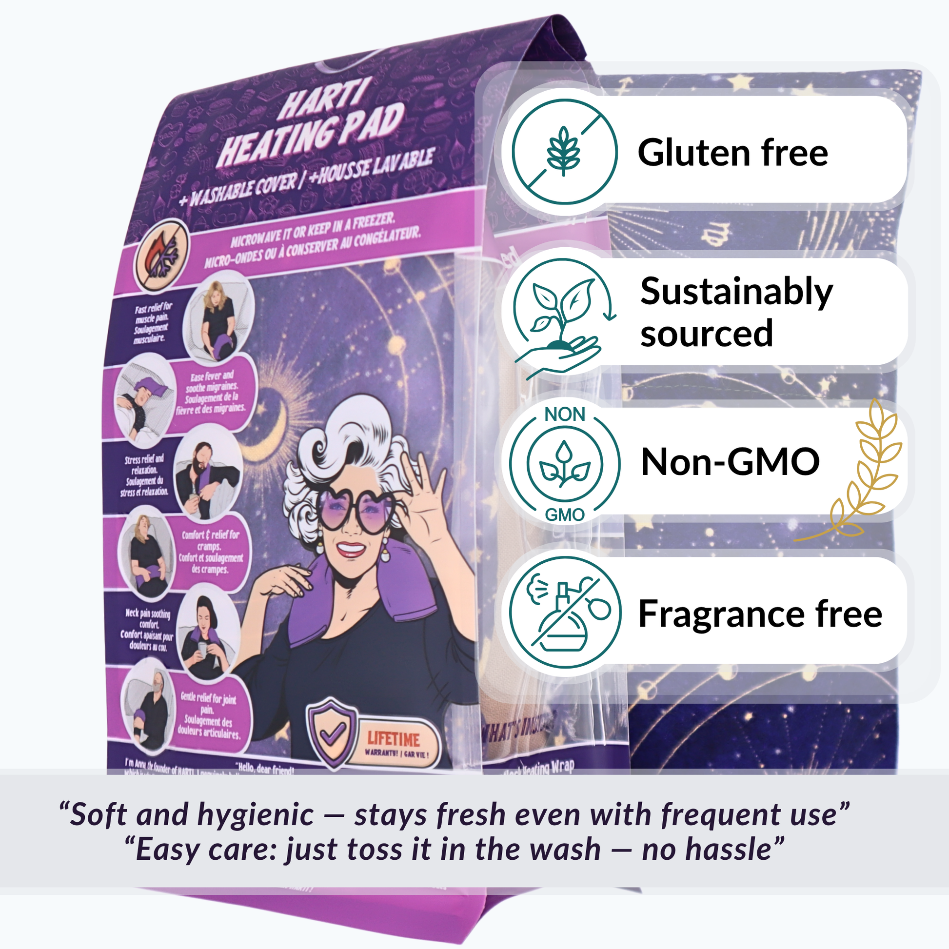 We use only whole Canadian-grown oats (non-GMO, gluten-free) that naturally retain heat and release a soothing, moist warmth. No chemicals, no gels, just pure nature in every pad.