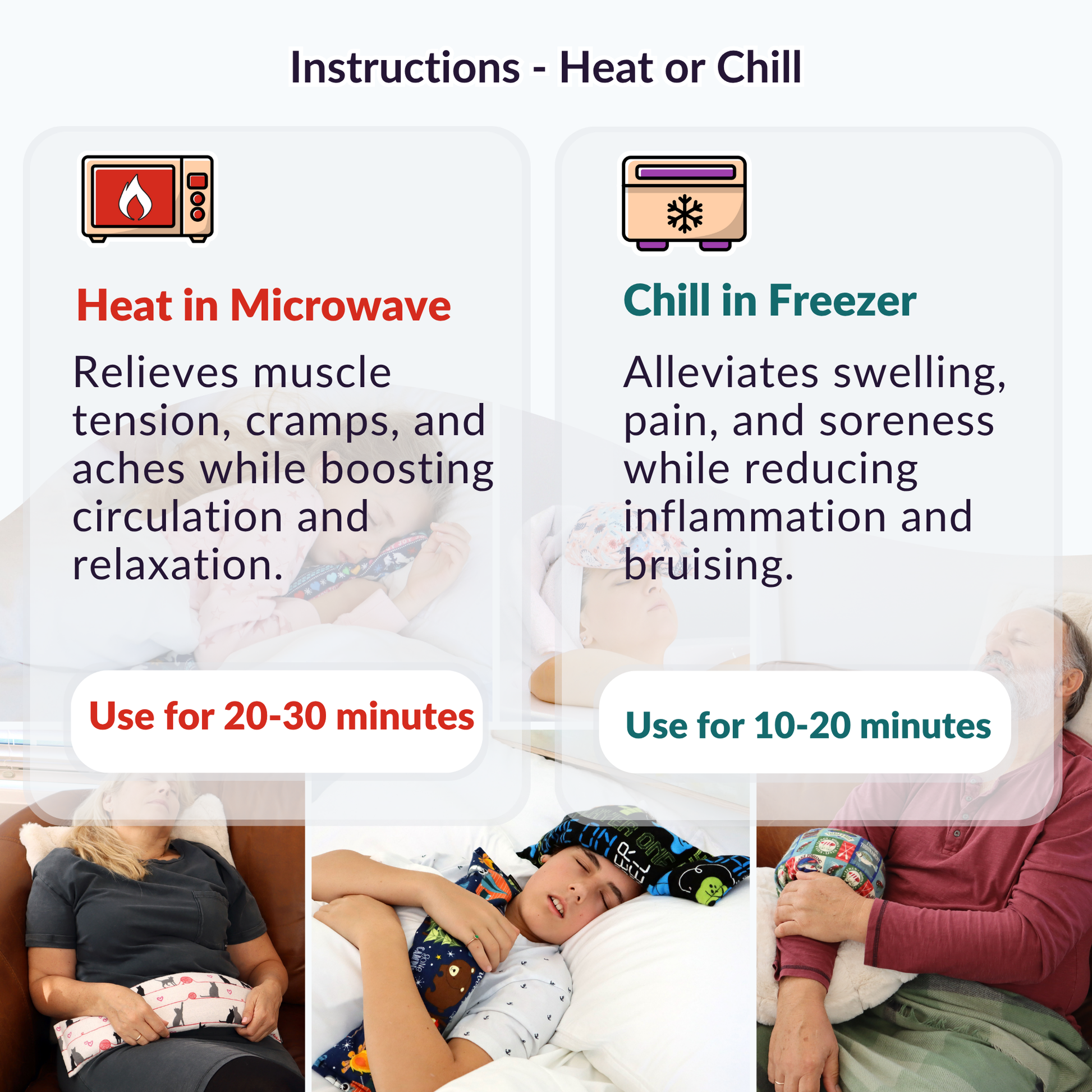 Warm it in the microwave for about 2 minutes for deep, lasting heat—or store it in the freezer for a refreshing cool compress. One pad, endless uses: muscle aches, cramps, headaches, swelling, or simple relaxation.